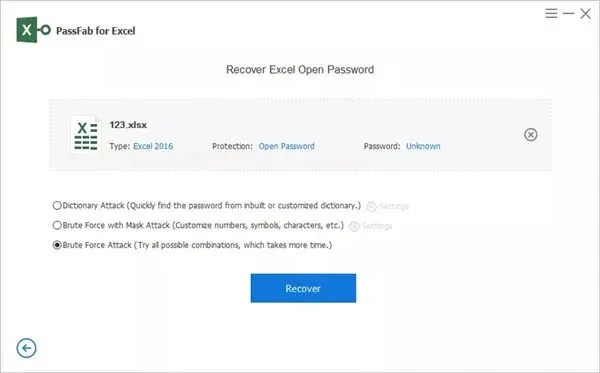 蛮力攻击 何时使用:如果您确实不知道丢失的 Excel 文件密码,那么这是最后但并非最不重要的选项。工作原理:单击主用户界面中的“暴力攻击”,然后单击“恢复”按钮执行 Excel 密码恢复。