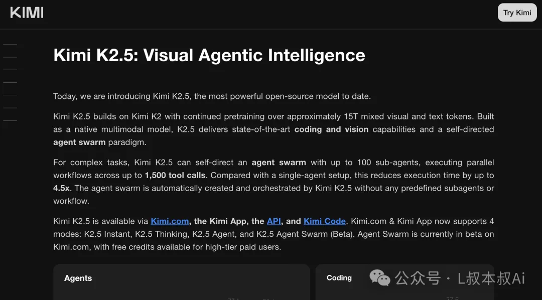 沉寂一段时间的月之暗面今早突然放了大招,在官网悄咪咪放出了Kimi K2.5模型