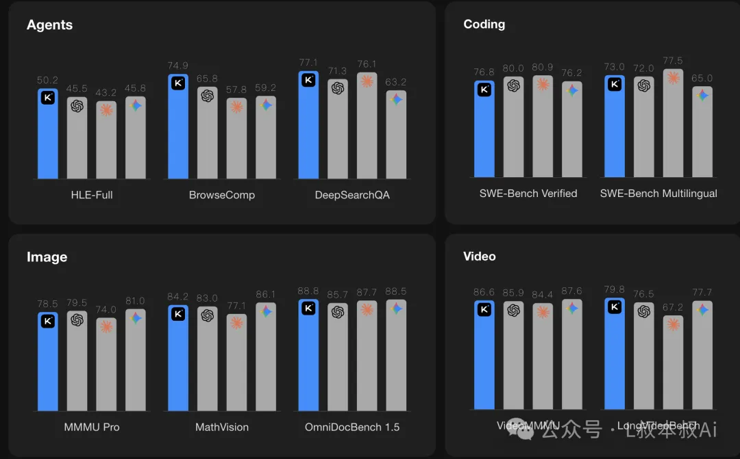 无论是在智能体复杂任务处理,还是编码,甚至在图像处理和视频上,都不弱于GPT-5.2,Claude-4.5,甚至许多多模态表现不输给Gemini 3 pro