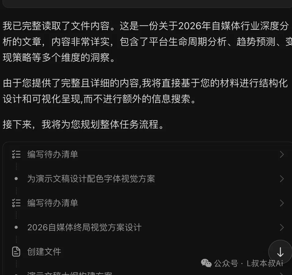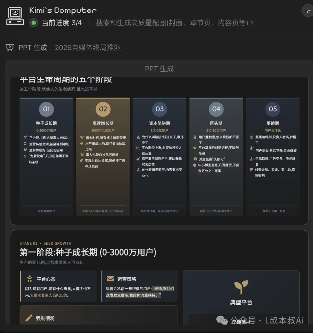 接着KIMI会开始按照一名PPT设计师一样,首先第一步,分析文字稿,提炼其中的内容结构,撰写PPT大纲