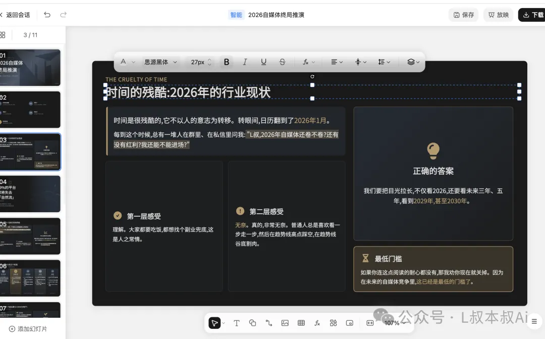 这是他最后生成的PPT,你觉得如何?我个人觉得80分以上的水平是绝对有的,尤其在一些多文字页面处理上,我觉得人类也很难比他超越太多。