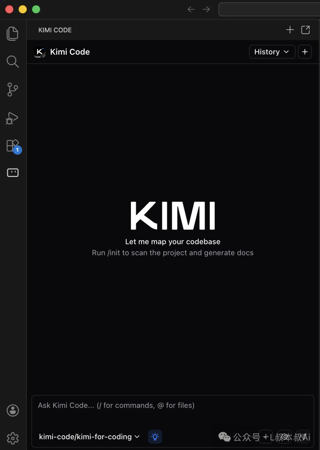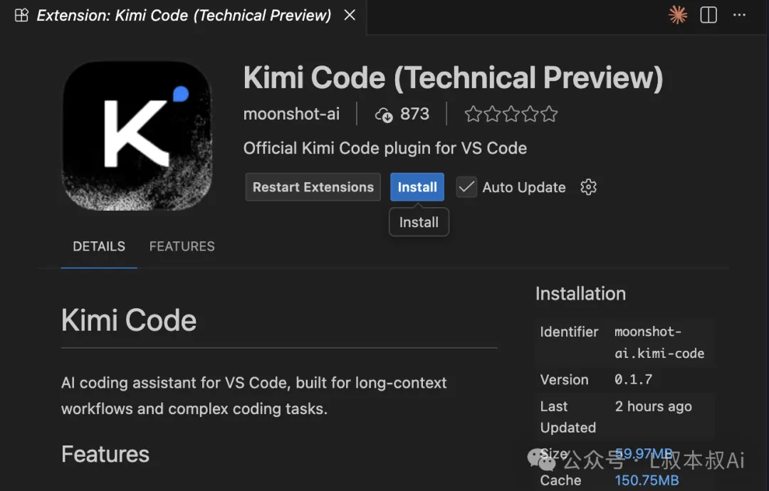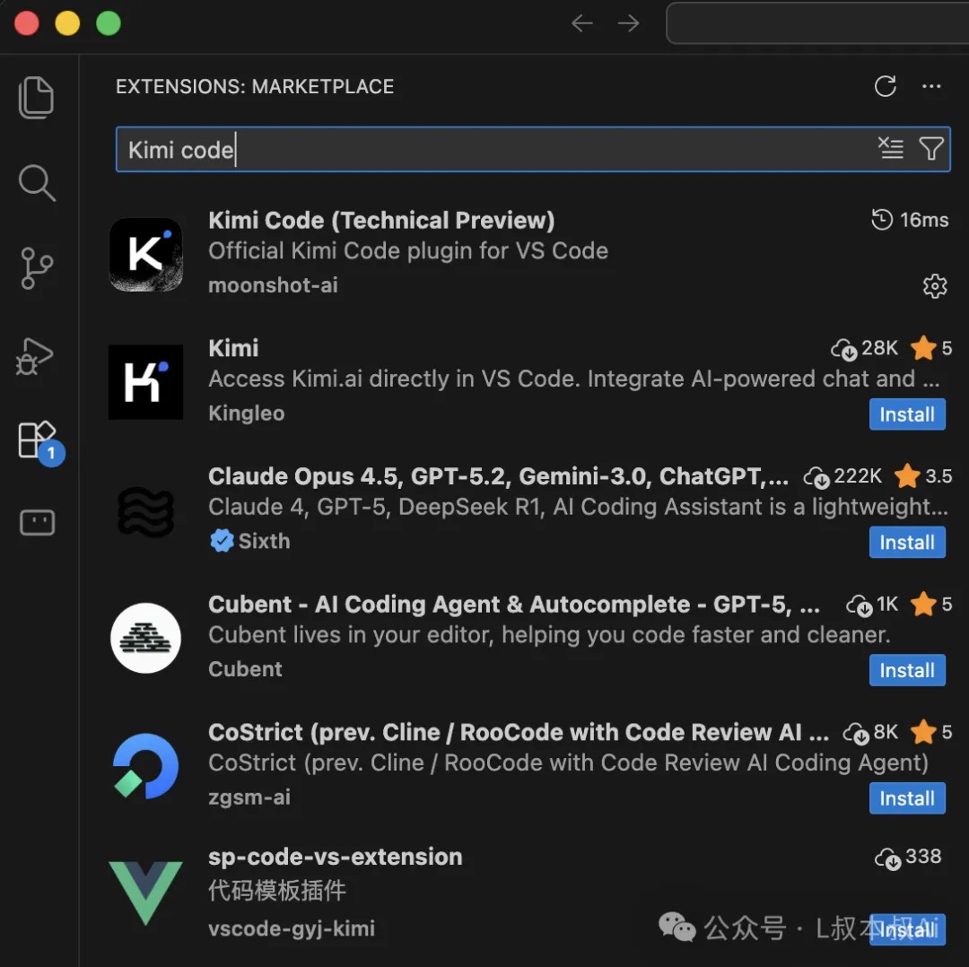 你只需要点击左边的Extensions(插件)然后在搜索栏里面搜索「Kimi code」