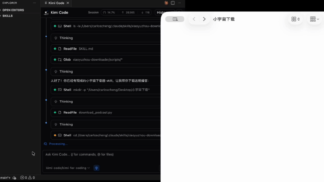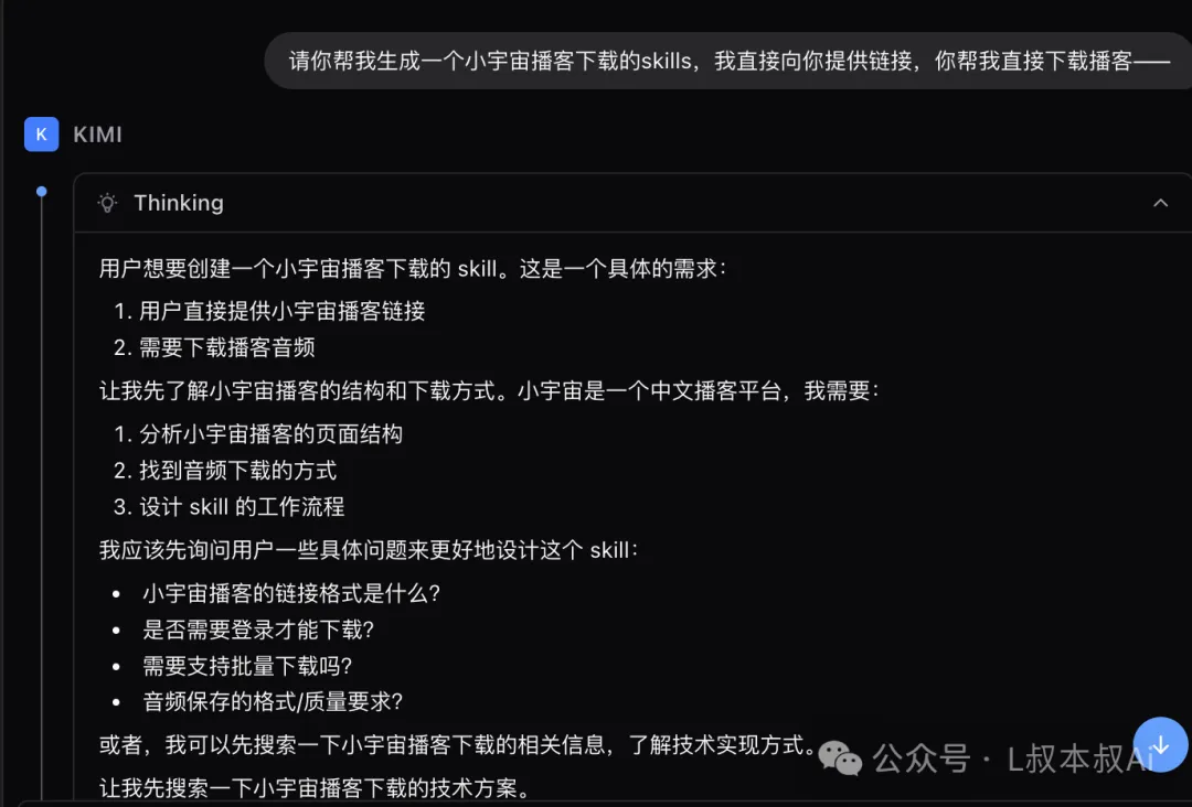 接着我试着和他说,请你帮我生成一个播客下载的skills,我直接向你提供链接,你帮我直接下载播客——
