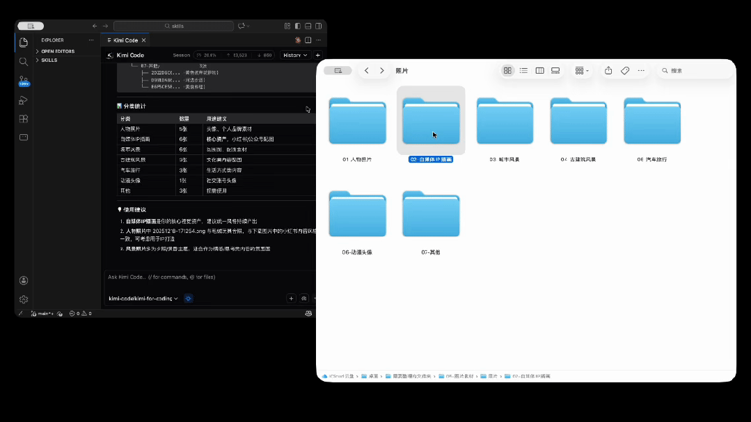 K2.5自带访问办公文档的能力和视觉的能力,不一小会儿,他就把内容文件跟我分类的非常清晰。
