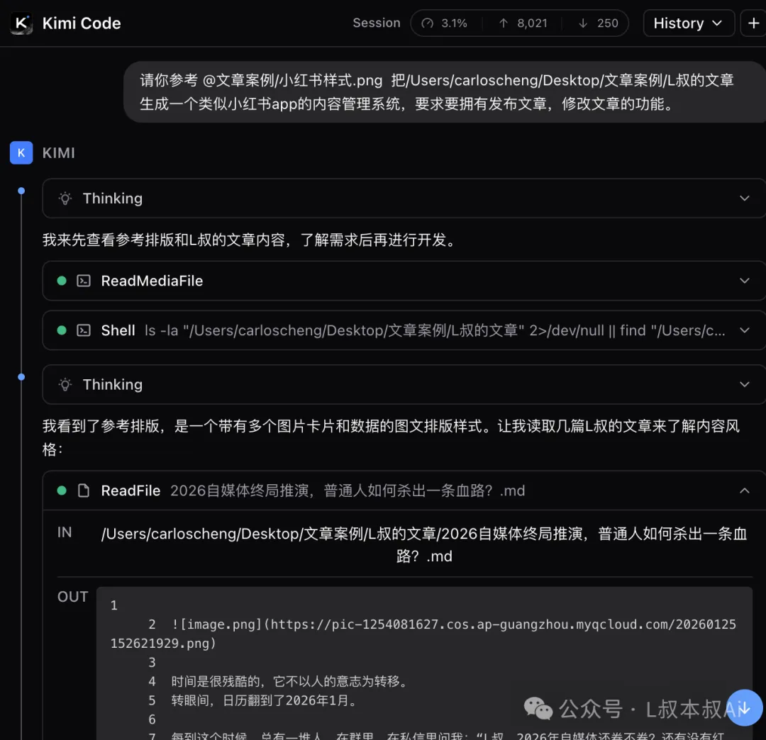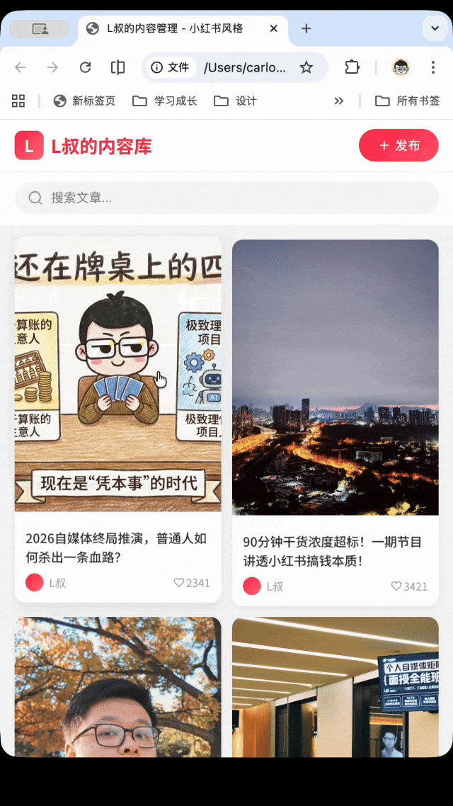 我随意截取了一张小红书的主页的照片,同时给到他4个推文文稿,和它说,请你参考小红书app的样式,帮我把xx文件夹下方的所有文件,生成一个类似小红书app的内容管理系统,要求要拥有发布文章,修改文章的功能。