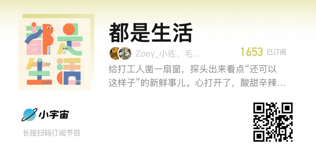 - 是两档播客主播,欢迎去各音频平台搜索订阅『都是生活』,一档关注都市人生活与视野,听着还挺开心挺有共鸣的节目,另一档节目「龟兔不赛跑」正在系统重启中,上线后会立刻来报!下面扫码速通: