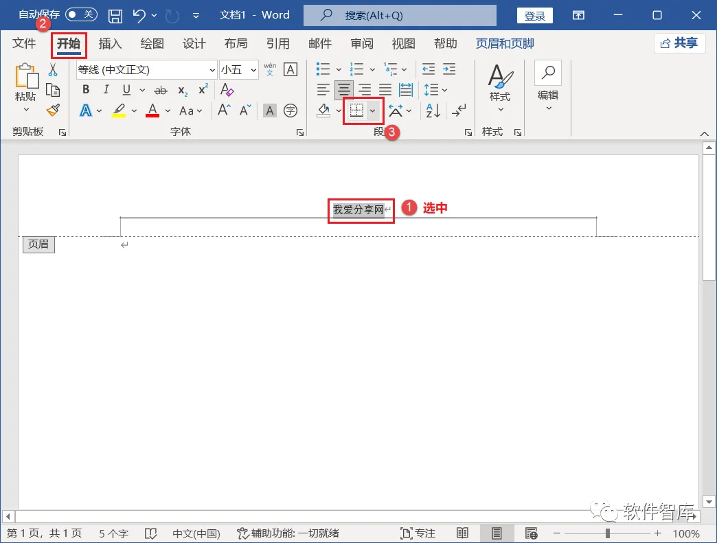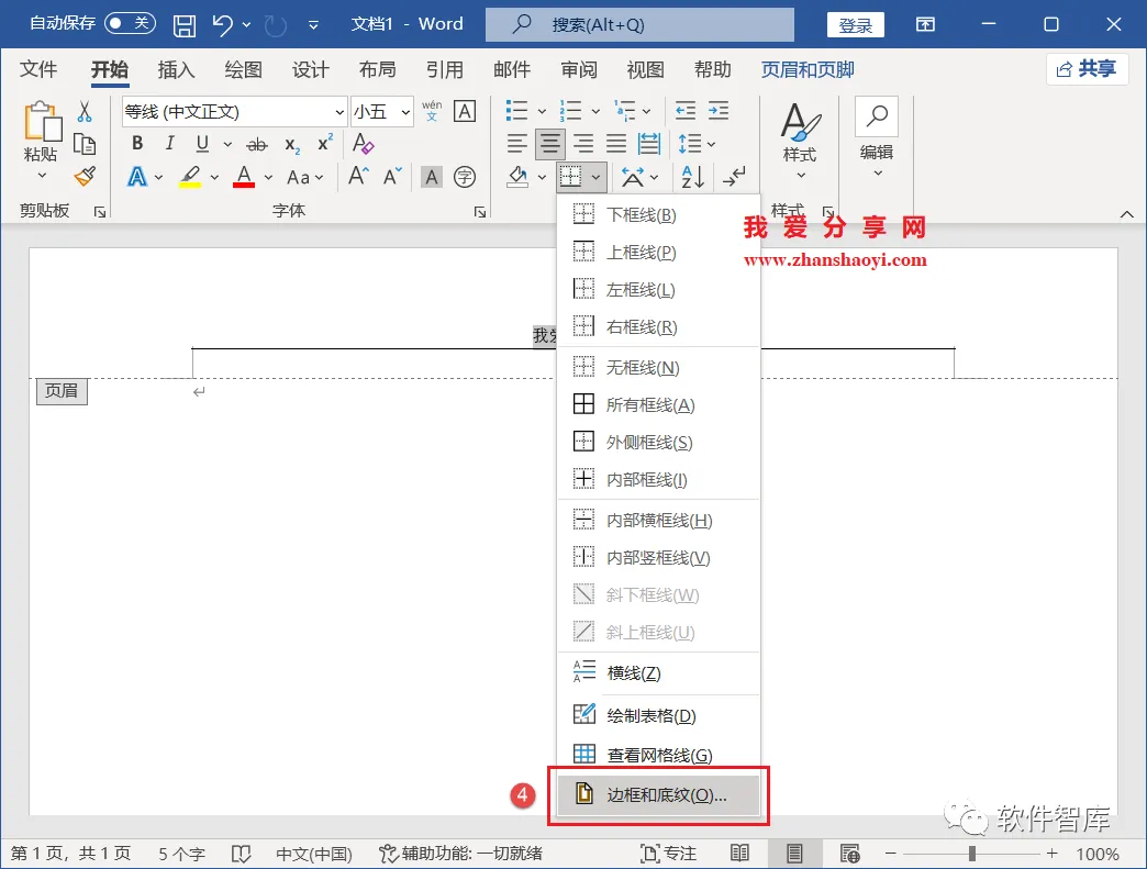 1、打开Word2021文档,双击进入页眉编辑状态,然后选中所有“页眉内容”,点击菜单栏【开始】,找到段落卡片中的【边框】按钮,在下拉列表中选择【边框和底纹】,