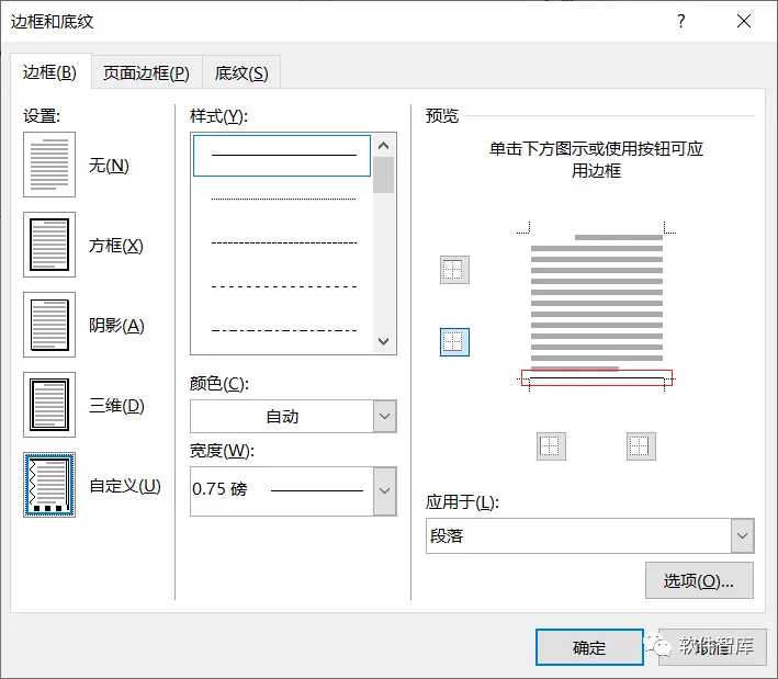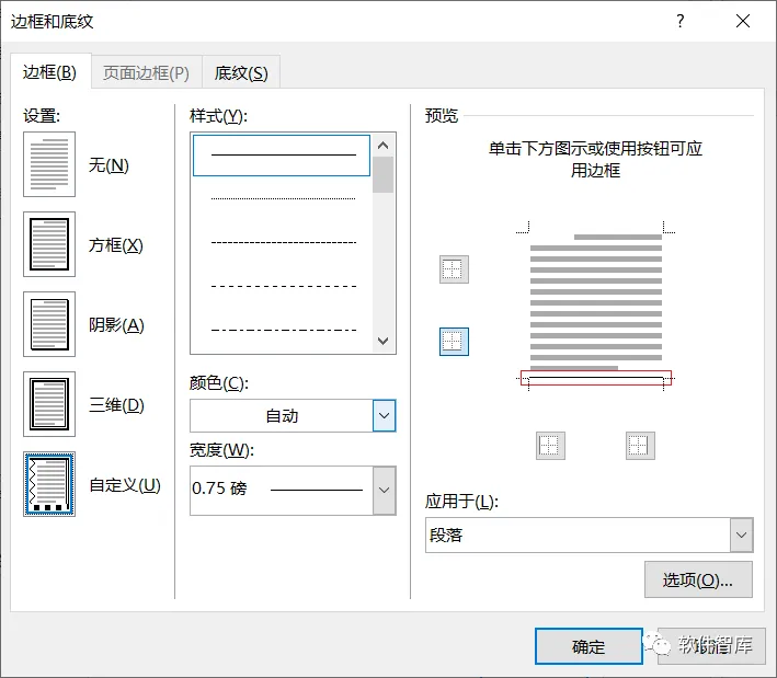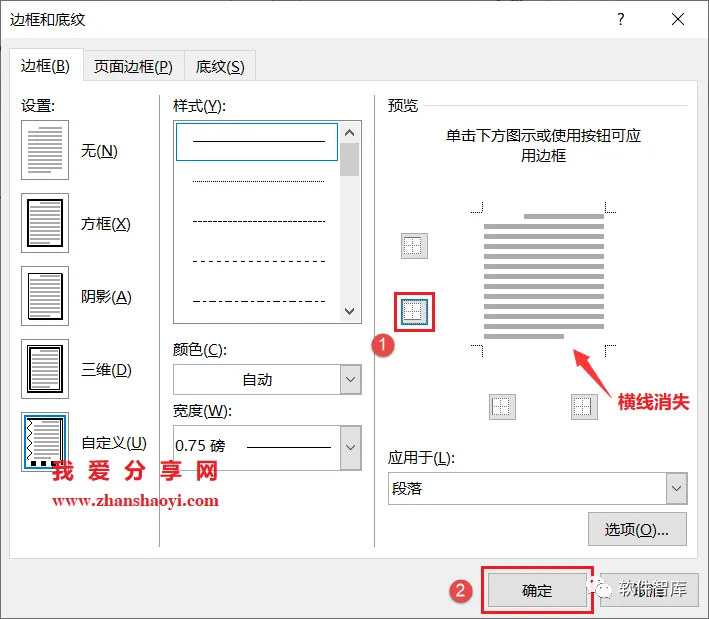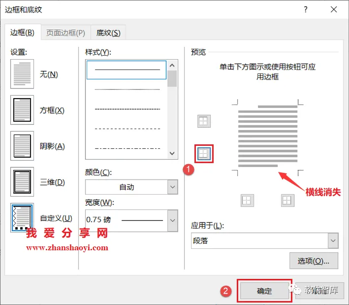 2、打开如下窗口,先点击【下框线】按钮,可以看到下框边线消失了,点击【确定】退出;