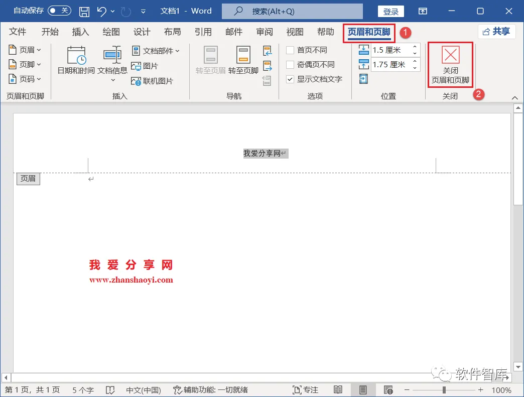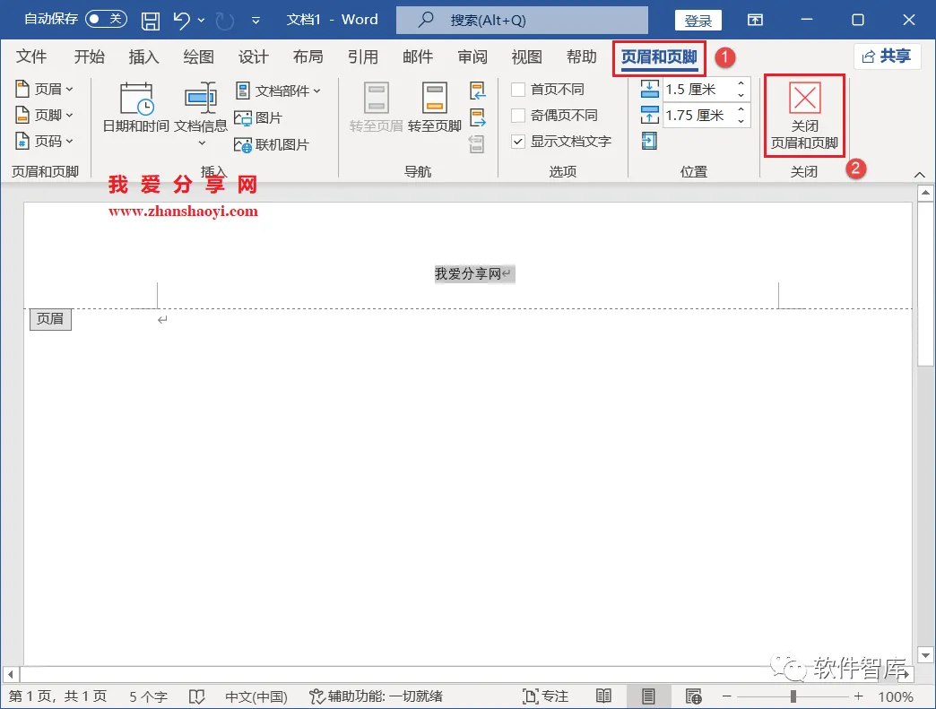 3、点击菜单栏中【页眉和页脚】,然后点击【关闭页眉和页脚】;