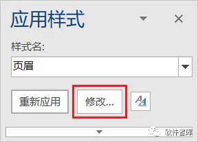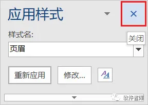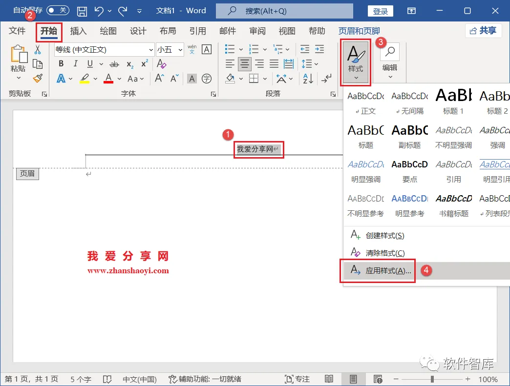 5、先进入页眉编辑状态,然后点击菜单中【开始】,点击【样式】卡片,在下拉列表中点击【应用样式】;