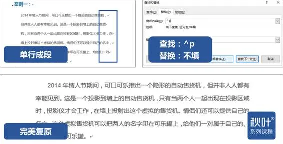 高效操作:在【查找替换】中,查找填入「^p」,替换处不填,一步还原为整段文本。