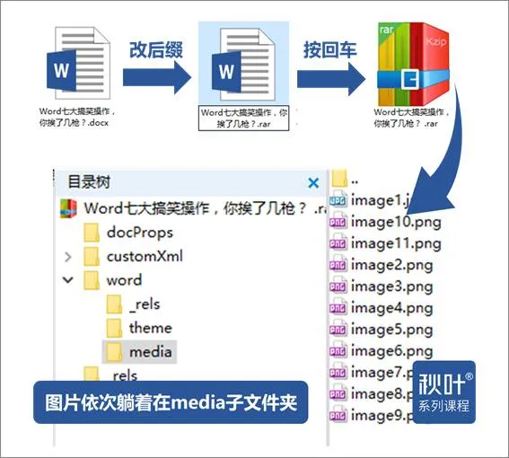 高效操作:直接把 Word 文档的后缀格式改为「.rar」,然后使用解压软件将其解压开来,然后你就看到,Word 中所有的图片都静静的躺在文件夹中了。