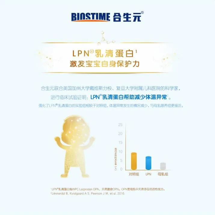 合生元还是少数敢做临床验证的奶粉,临床数据证明,添加LPN乳清蛋白的配方奶粉,可减少发热,提升宝宝自身免疫力。