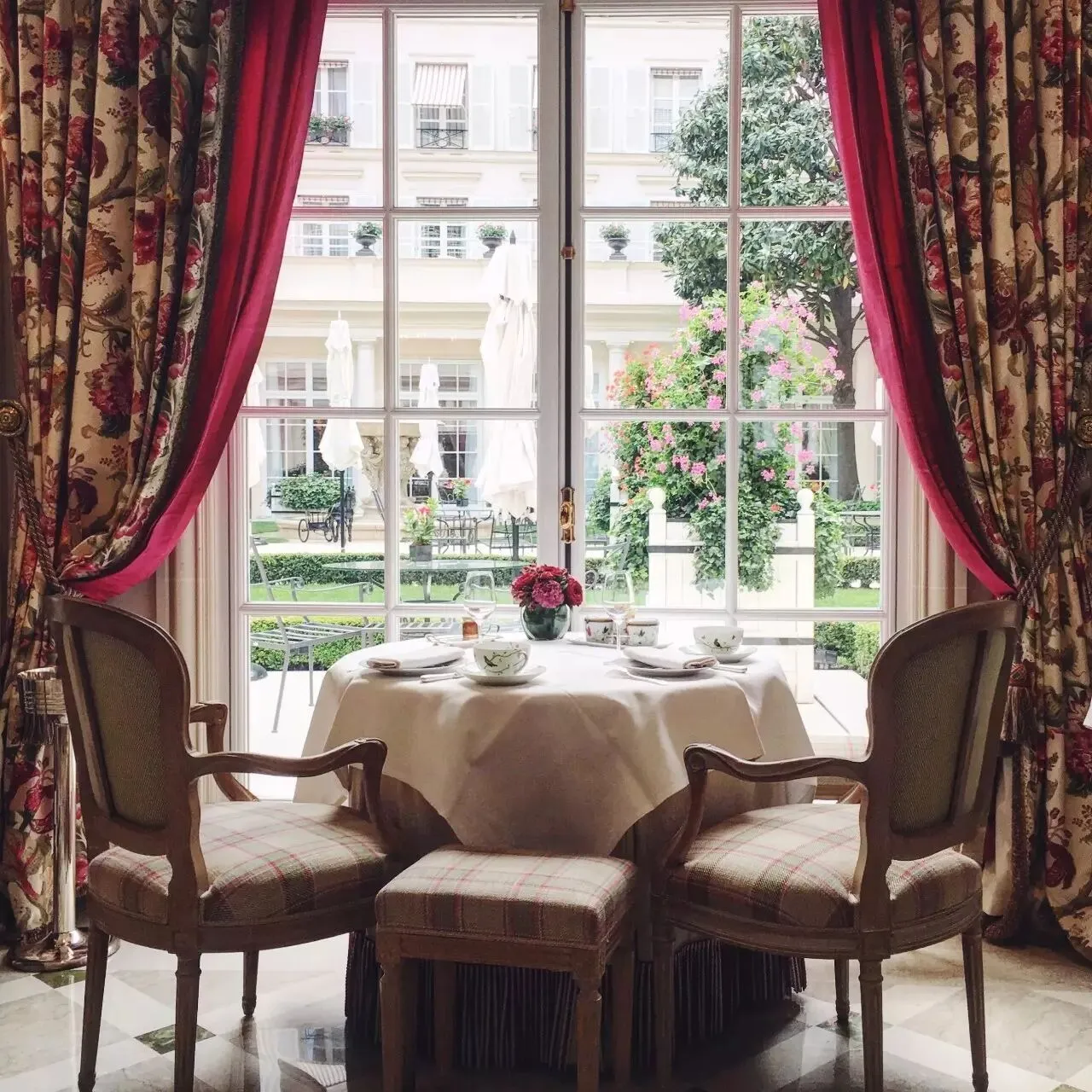 酒店早餐面对着童话般的法式花园,桌布、餐盘、银器、鲜花都完美演绎着精致的巴黎气质。 如果天气够暖和,你也可以直接到花园中享用早餐。