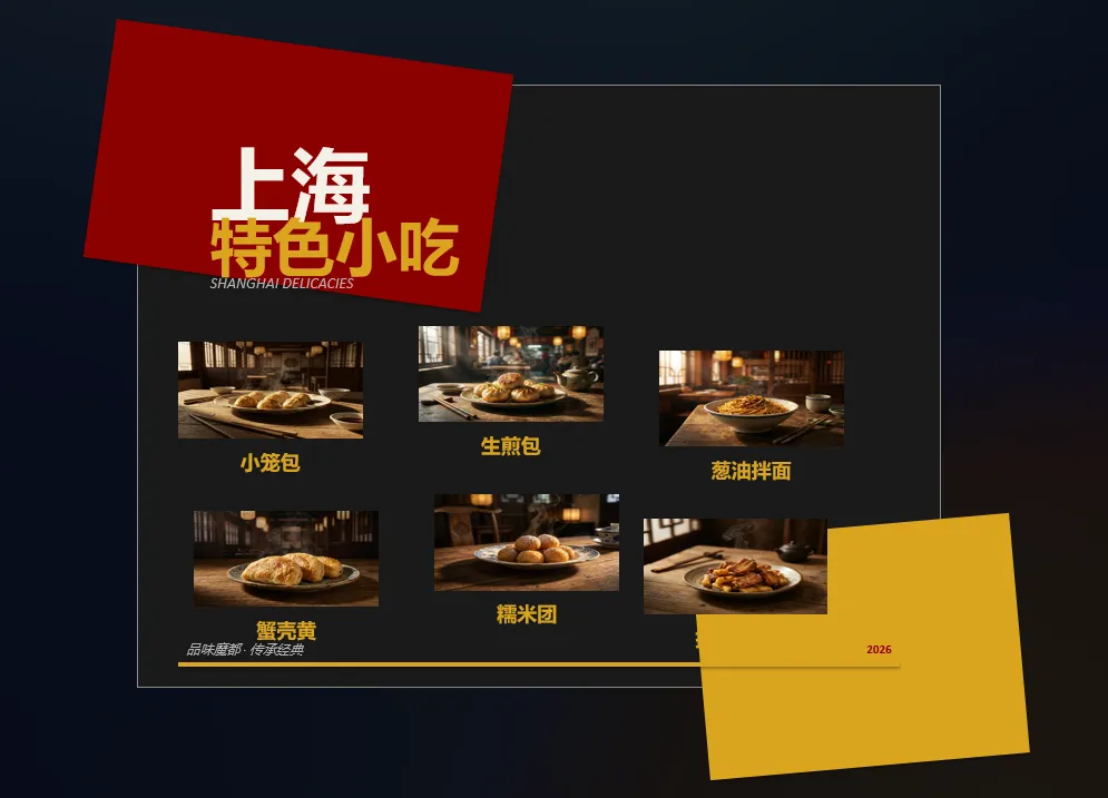 其实技能之间也可以相互合作,比如我们可以用上一次介绍的美学叛逆者front-design技能来帮助设计优化ppt。现在先用ppt技能生成一页介绍上海特色小吃的ppt,在没有使用frontend-design之前,ppt效果非常普通,没有什么设计感