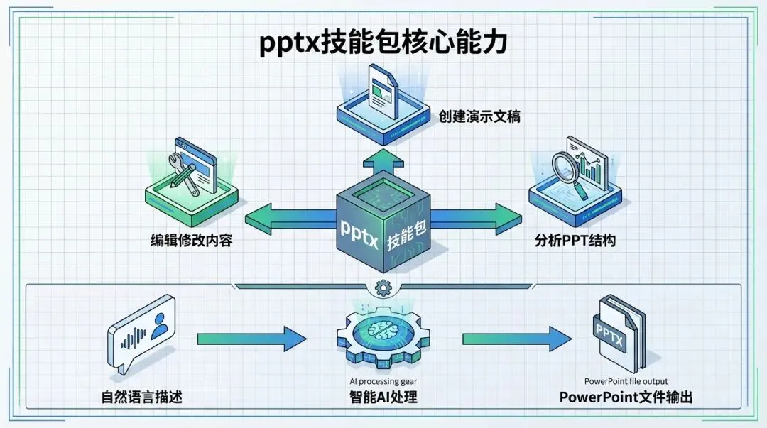 今天要给你介绍的这个 pptx 技能包,就是专门为解决这些痛点而生的。它让 Claude 具备了创建、编辑和分析 PowerPoint 演示文稿的能力。你只需要用自然语言告诉 Claude 你想要什么样的PPT,它就能帮你生成;你想修改某些内容,它也能精准操作;你想分析一份PPT的结构和内容,它同样能快速完成。