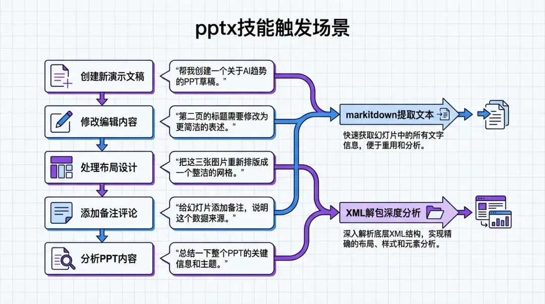 技能包提供了多种工作流程。如果你只是想快速提取PPT的文本内容,Claude 会使用 markitdown 工具将演示文稿转换为 Markdown 格式,这样你就能快速浏览所有文字信息。如果你需要深入分析PPT的结构(比如查看演讲者备注、评论、动画效果等),Claude 会将 .pptx 文件解包,读取其中的 XML 文件来获取详细信息。