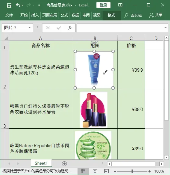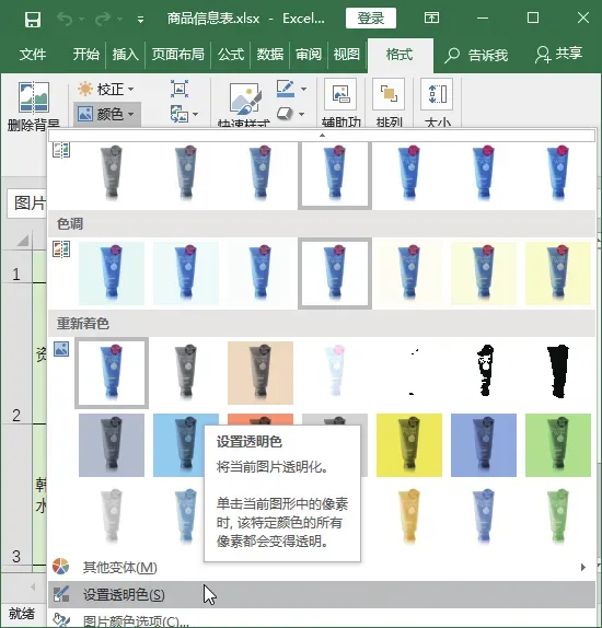 在抠图时,如果需要处理图片的背景为纯色,可以使用设置图片背景颜色为透明的方法将纯色背景去除。例如,由于商品信息表中的单元格填充了淡绿色的背景,图片的纯白色背景不能让产品与内容更和谐,因此需要将白色设置为透明色,具体操作步骤如下。Step01 选择设置透明色命令。