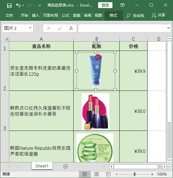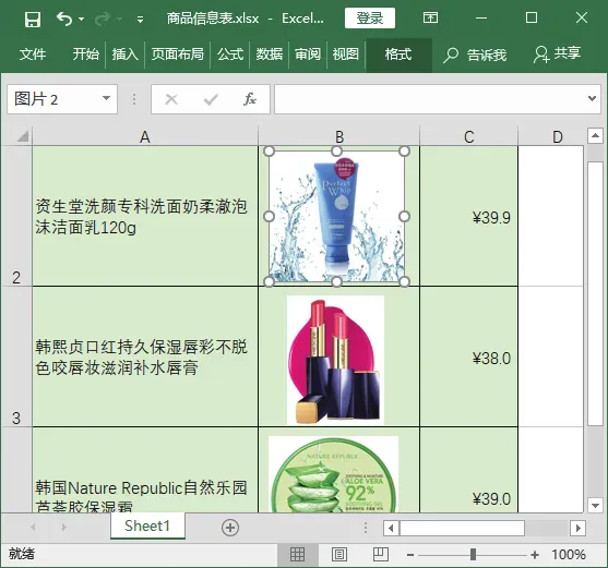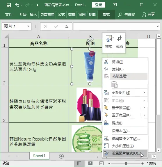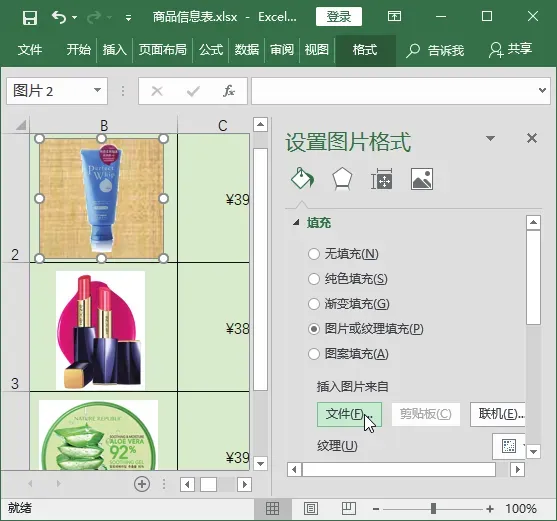 选择第 1 张图片并右击,在弹出的快捷菜单中选择【设置图片格式】命令。打开【设置图片格式】任务窗格,单击【填充与线条】按钮,在【填充】栏中选中【图片或纹理填充】单选按钮,单击【文件】按钮。打开【插入图片】对话框,在上方的下拉列表中选择要插入图片所在的文件夹,在下面的列表框中选择【水纹】选项,单击【插入】按钮。返回工作簿中即可查看到为洗面奶图片更换的背景效果。技巧 03:让表格中图片大小随单元格大小的变化而变化