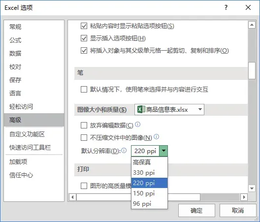 默认情况下,会将图片取样缩小到分辨率为 220 ppi,但是这个置值可以在【Excel 选项】对话框中进行更改,具体操作方法如下。