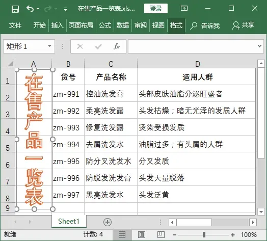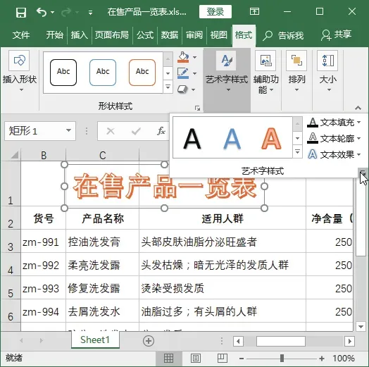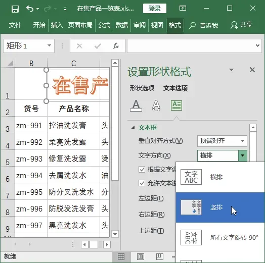 例如,对在售产品一览表中艺术字标题文本的方向进行更改,具体操作步骤如下。