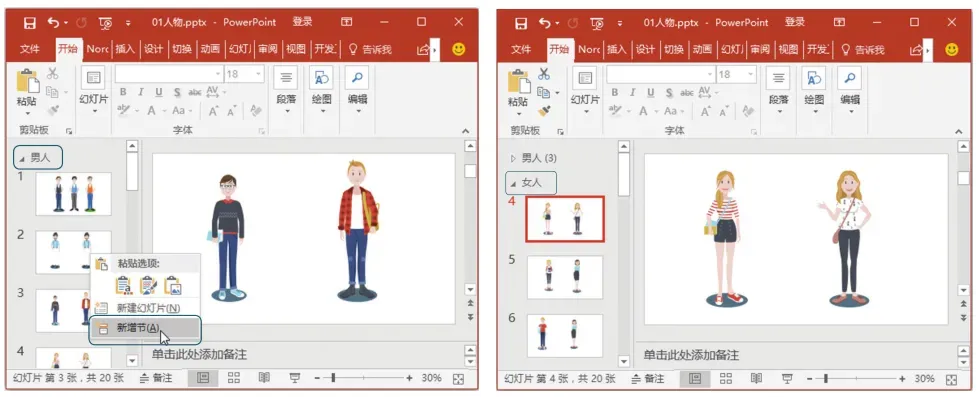 右击第3张到第4张幻灯片的空隙,单击【新增节】命令,增加一个名为【女人】的素材“节”,效果如右下图所示。