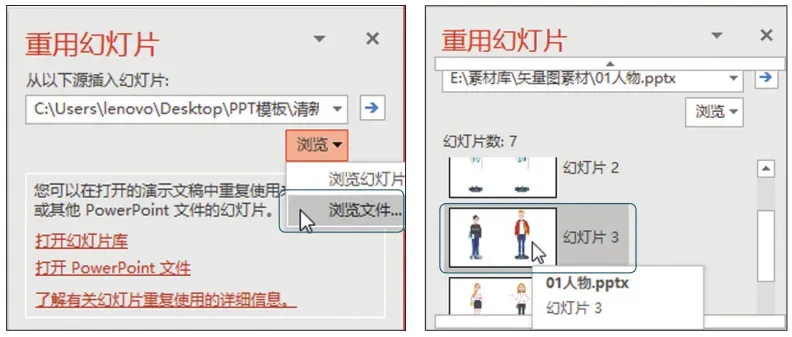 单击【新建幻灯片】按钮,从下拉菜单中选择【重用幻灯片】选项,如下图所示。在【重用幻灯片】窗格中单击【浏览】菜单中的【浏览文件】选项,如左下图所示,选择素材文件打开。