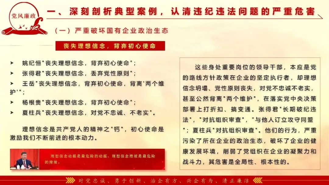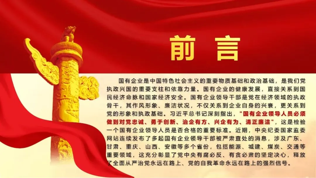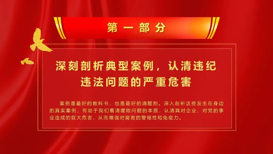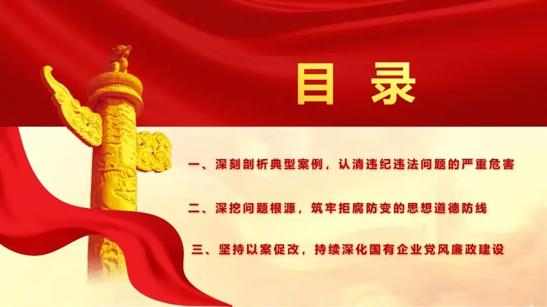 今天我们召开这次党风廉政教育专题党课,主要目的是通过深入剖析近期查处的国有企业领导干部严重违纪违法典型案例,教育引导公司全体党员干部特别是领导干部,以案为鉴、警钟长鸣,深刻认识党风廉政建设和反腐败斗争的长期性、复杂性、艰巨性,进一步增强廉洁自律意识和拒腐防变能力,共同营造风清气正的政治生态和干事创业的良好环境,为集团公司高质量发展提供坚强纪律保障。