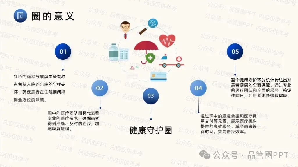 红色的雨伞与盾牌象征全程关怀,医疗团队图标代表专业技术,健康守护环的设计旨在通过专业团队和全面服务,缩短住院日,让患者更快康复,同时环中的紧急救援和医疗费用支付等元素也展示了医疗机构的高效服务,减少患者等待,提升医疗效率。