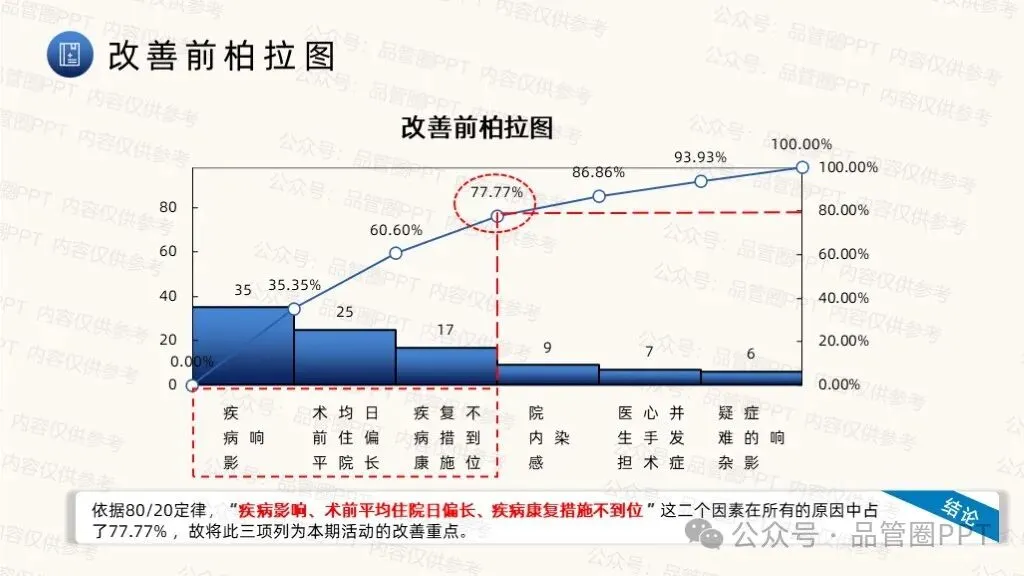 依据80/20定律,“疾病影响、术前平均住院日偏长、疾病康复措施不到位“这二个因素在所有的原因中占了77.77%,故将此三项列为本期活动的改善重点。