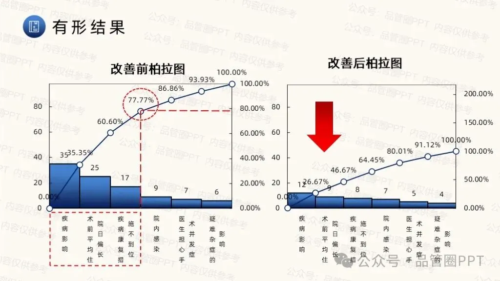 改善前柏拉图与改善后柏拉图,效果对比显著,充分展现了优化措施的实际成效。
