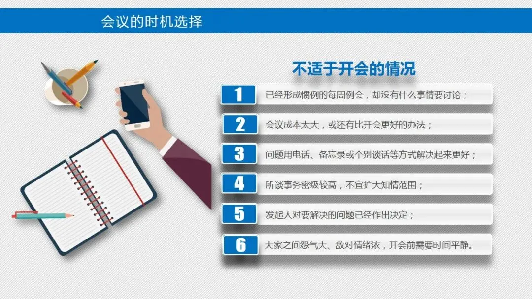 “会议五不”从行为规范、沟通边界、氛围营造等维度为会议划定红线,与“会议五有”相辅相成,共同构建高效、务实、有序的会议生态。