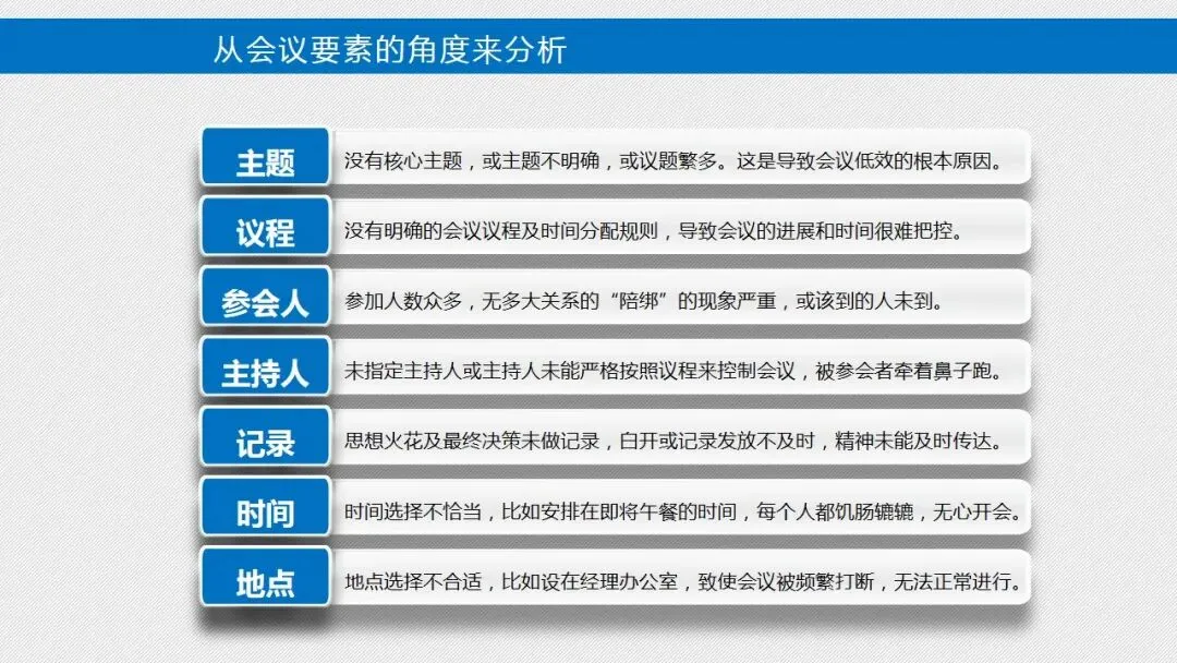 很会企业的都会通过大大小小的会议来解决,商议问题和决策等,可是很多会议都存在低效且不能解决问题,并且还浪费时间。