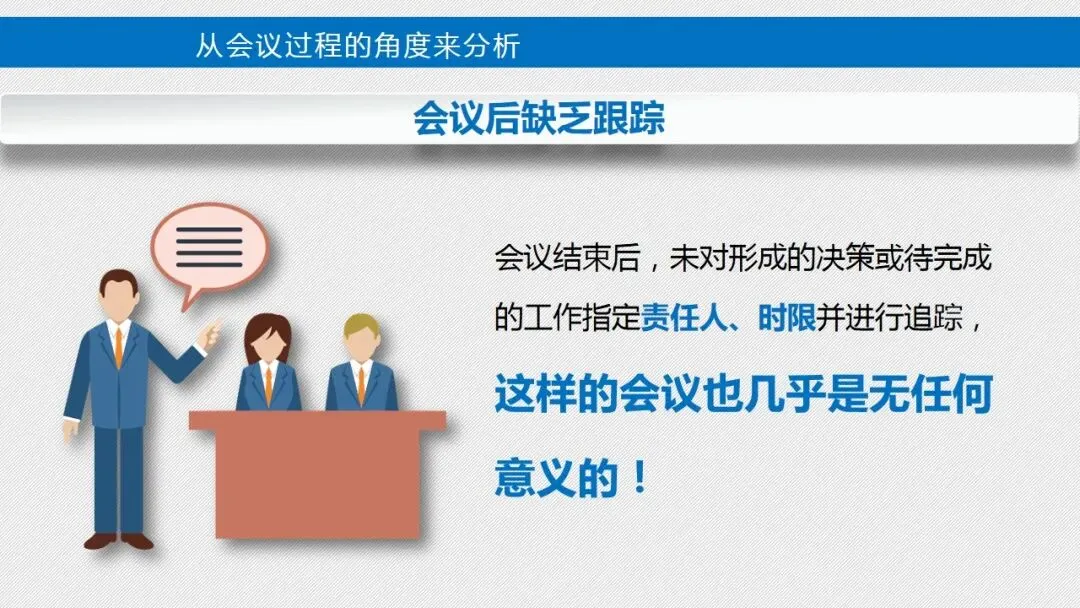 很多企业大大小小的会议是开了不少,可是会后没有跟进,没有执行到位,结果不能有效的完成会议内容,而导致会议低效,所以会后跟进检查是最终衡量会议是否有成效的最重要一步;
