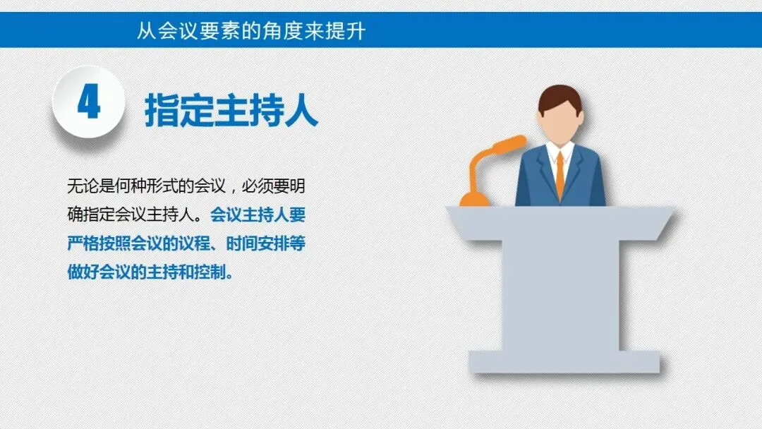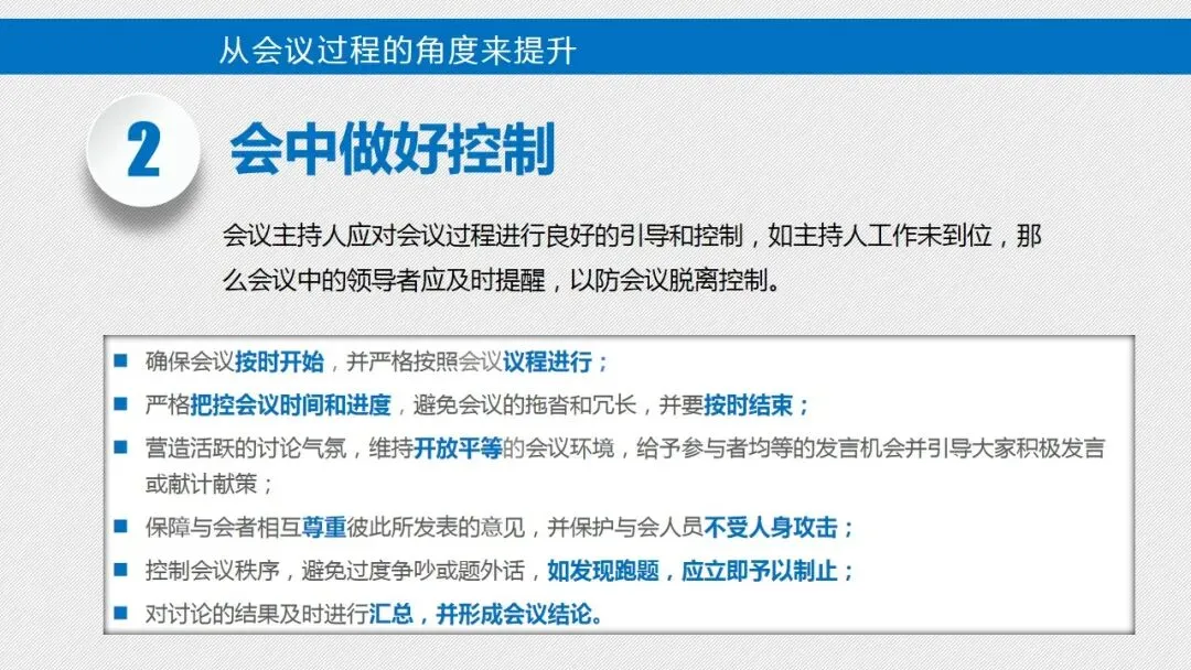 会议主持人要有良好的引导和控场能力,严格控制好会议时间;
