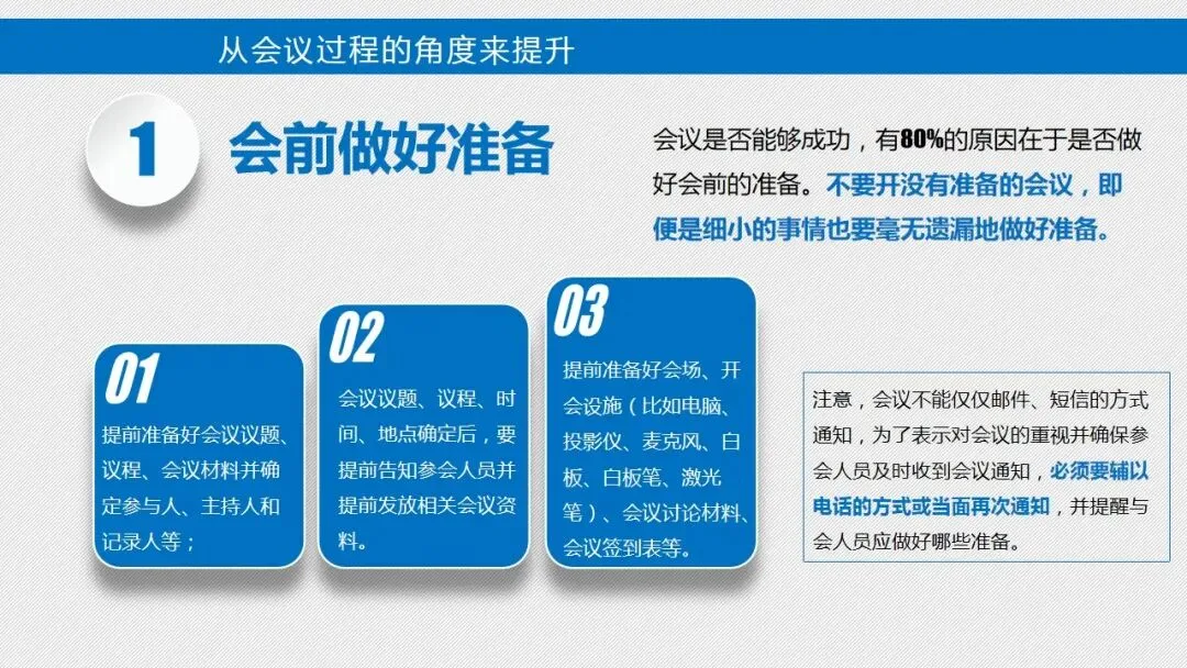 会议要明确会议主题,(会议是要解决什么问题,是要做什么决策的),时间安排(会议开展时间以及会议时长的控制),同时也要做好相关内容数据等准备(不要讲一半了结果没数据举证),包括人员参会通知,会议室的安排等等,只有做好了相关准备,会议才能有序而有效的进行。