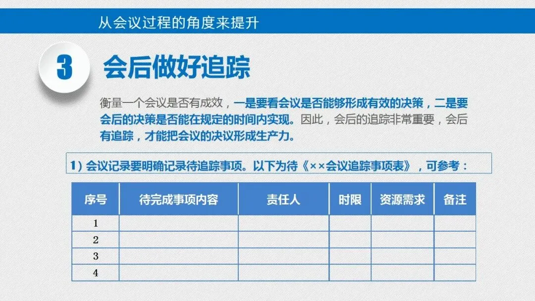 会议记录要明确记录待追踪事项。以下为待《××会议追踪事项表》,可参考:针对会议完成情况进行考核,必要的时候可对责任人进行处罚;