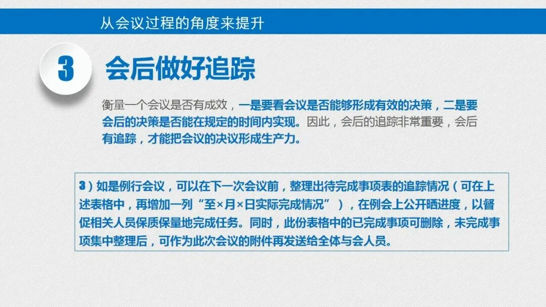有检查是会议的落地关键:会后需形成明确的会议纪要,梳理决议事项、责任主体、完成时限;建立跟踪检查机制,定期督办任务进展,及时协调解决执行难题,确保会议形成的共识不流于纸面,真正转化为实际成果,形成“会议—执行—反馈”的闭环。