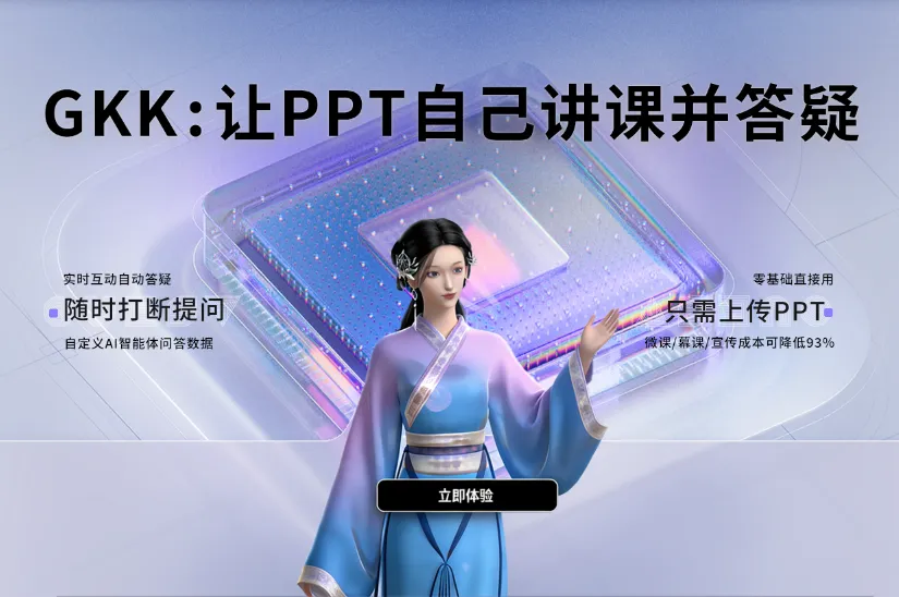 GKK是一款基于3D数字人与人工智能的智能授课系统,只需上传PPT或PDF课件,即可自动生成由AI数字人主讲的互动课堂。它不仅会“讲”,还会“听”、会“答”,真正让课件拥有“灵魂”。