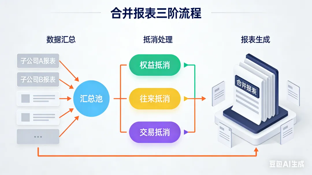 合并报表的流程看似简单,实则暗藏诸多细节,每一步都容不得差错,具体可分为 “三步走”: