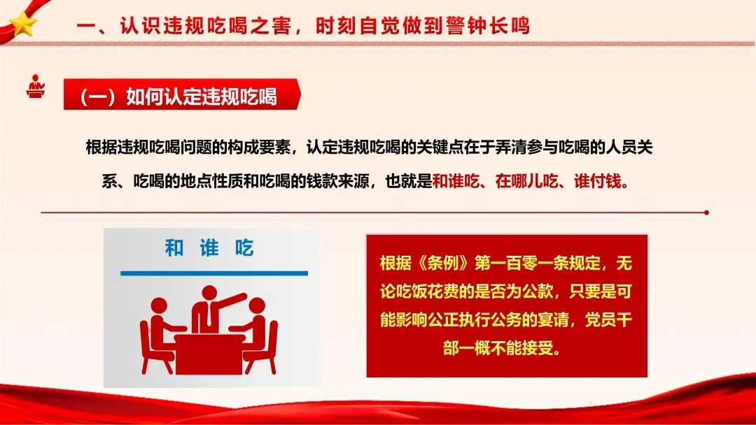 违规吃喝绝不是小事小节,是作风建设的大敌,是腐败的“催化剂”,一旦成风,势必严重破坏党内政治生态,严重影响党的形象,严重损害党群干群关系。党员干部要时刻自重自省自警自励,慎独慎微慎始慎终,始终保持健康的工作方式和生活方式,洁身自好、防微杜渐,自觉净化社交圈、生活圈、朋友圈,形成清清爽爽的同志关系、规规矩矩的上下级关系、亲清统一的新型政商关系,当好良好政治生态和社会风气的引领者、营造者、维护者。今天,围绕“筑牢抵制违规吃喝防线,敲响清正廉洁警钟”和大家交流一堂专题党课。
