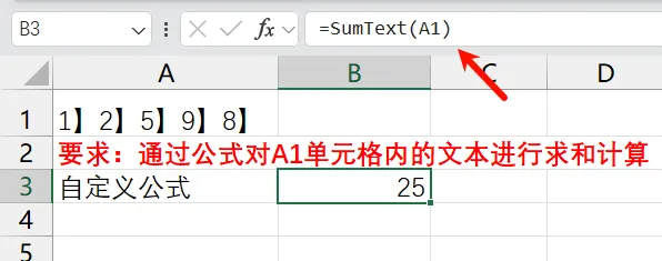 Function SumText(inputText As String) As Double ' 功能:计算用"】"分隔的数字字符串的总和 Dim numbers() As String Dim i As Long Dim total As Double Dim cleanText As String ' 处理空输入 If inputText = "" Then SumDelimitedNumbers = 0 Exit Function End If ' 移除末尾多余的分隔符(如果存在) cleanText = inputText If Right(cleanText, 1) = "】" Then cleanText = Left(cleanText, Len(cleanText) - 1) End If ' 用"】"分割字符串 numbers = Split(cleanText, "】") ' 初始化总和 total = 0 ' 遍历所有分割后的元素 For i = LBound(numbers) To UBound(numbers) If numbers(i) <> "" Then ' 跳过空元素 ' 尝试转换为数字并累加 If IsNumeric(numbers(i)) Then total = total + CDbl(numbers(i)) Else total = total + 0 End If End If Next i ' 返回计算结果 SumText = totalEnd Function