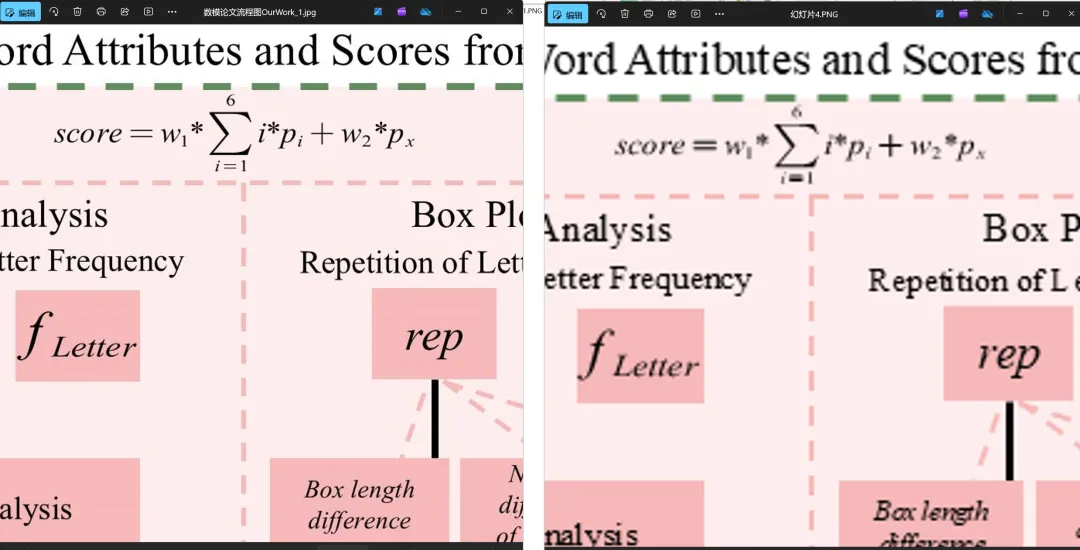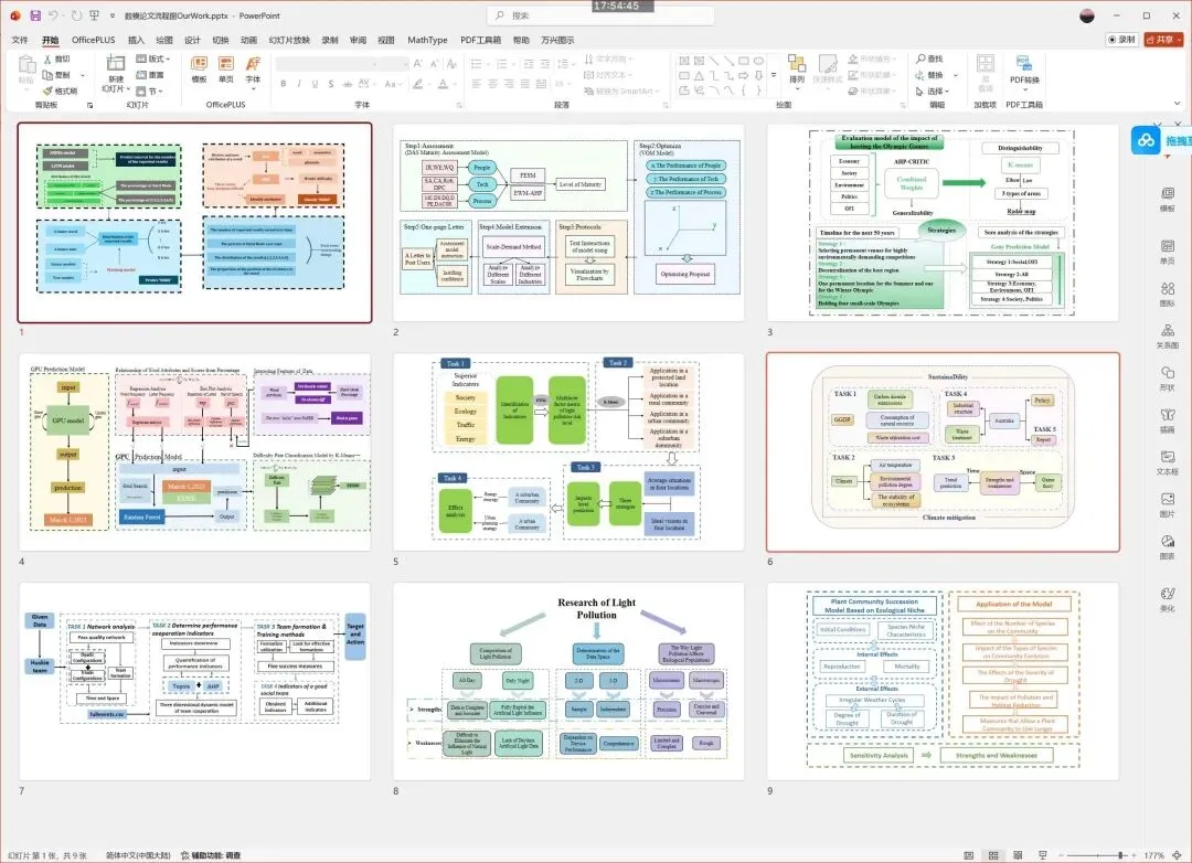 大家好 我是北海~流程图在论文中很常见,美赛中“Our work”部分往往就是一张流程图概括全文思路。常用的visio、ProssOn和PPT都可以绘制流程图,例如下面PPT的9页流程图,都是PPT自带的插入形状、文字,调整颜色、边框等等参数:此PPT流程图模板已加入数模AI知识库,在03-美赛备战指南内的编号14的文件,可以下载到电脑编辑。关注本公众号:数学建模BOOM,后台回复【知识库】查看加入方式。但有个问题:在PPT内这些流程图是一个个组件,怎么保存高分辨率的图片用在论文里呢?如果直接在PPT里选择“文件—另存为—png”的话,导出的图片清晰度较低,放大后更明显;网上也有修改注册表的方法,但对很多同学来说操作比较困难。安装OneKey后,在菜单栏OK10下选择“OK拼图->导图设置”在设置里DPI设为600就足够了,格式可选择jpg或tif都行,设好后“保存设置”再点关闭。问题不大,只需要点击一下左边导航你需要导出的那一页,或者可以按住Ctrl键再依次左键单击以选中多页,然后再“OK拼图->页面导图”下面是对比,左边是OK导出的,右边是PPT“另存为”得到的,可以看出放大到一定程度后,清晰度差别很明显。获取onekey插件安装包,可在本公众号后台回复“onekey”👉文中流程图PPT模板,以及400+页绘图素材均已上传知识库,【往期文章】