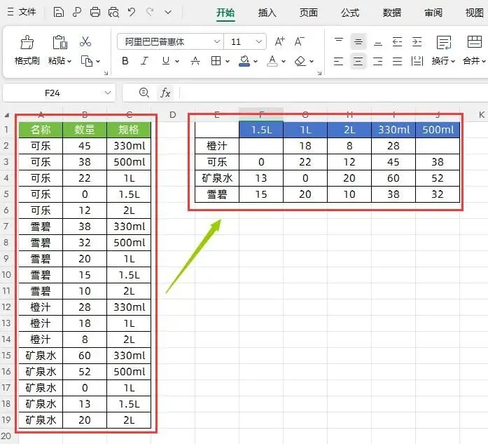 如下图所示,我们需要把左边的一维表格转换成右侧的二维表格。
