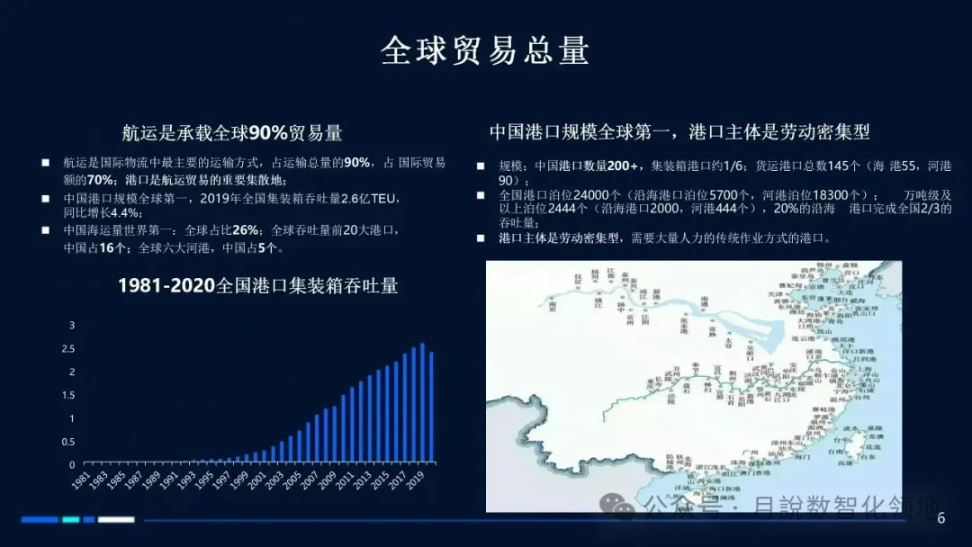 从行业痛点来看,传统港口运营模式的瓶颈日益凸显。长期以来,传统港口依赖人工操作与经验决策,存在作业效率低、人力成本高、安全风险大、资源配置不合理等问题。随着全球海运贸易量持续增长与船舶大型化趋势加剧,传统港口的吞吐能力、作业速度已难以匹配贸易发展需求,亟需通过智能化转型突破产能与效率瓶颈。同时,港口作为能源消耗与碳排放的重要场景,在全球碳中和目标下,绿色转型压力凸显,而数智化技术正是实现能源高效管理、节能减排的核心路径。