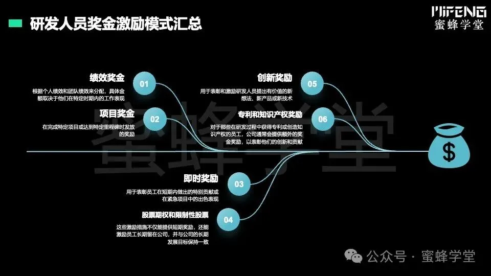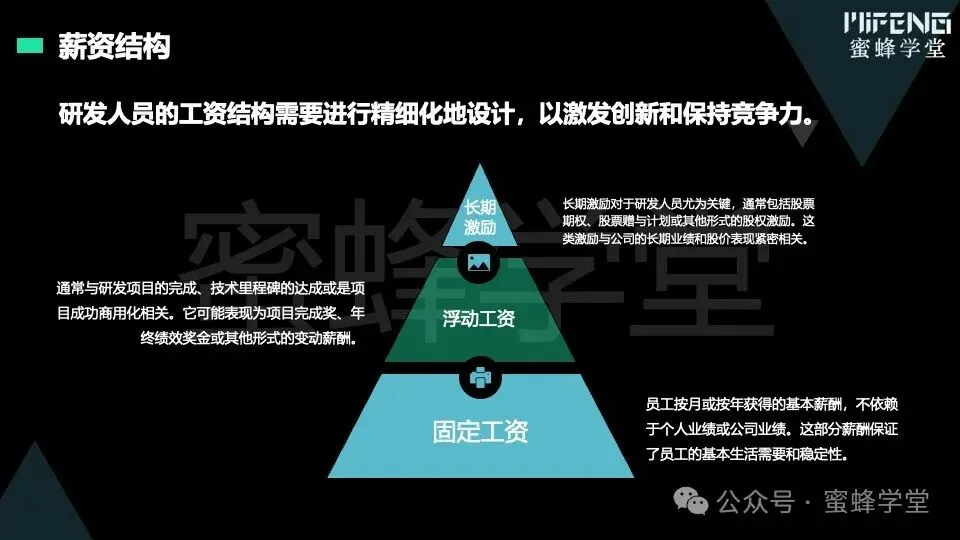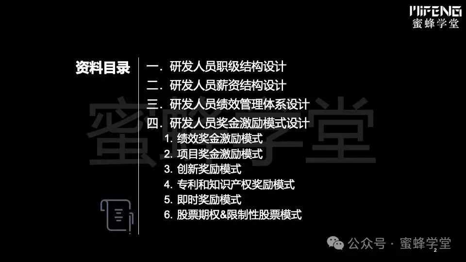 这里我们带来了一份独家原创ppt资料,一共63页,内容涵盖:研发人员职级结构设计、薪资结构设计、绩效管理体系设计、奖金激励模式设计,又细分:绩效奖金模式、项目奖金模式、创新奖励模式、专利和知识产权奖励模式、即时奖励、长期奖励如股票期权等~