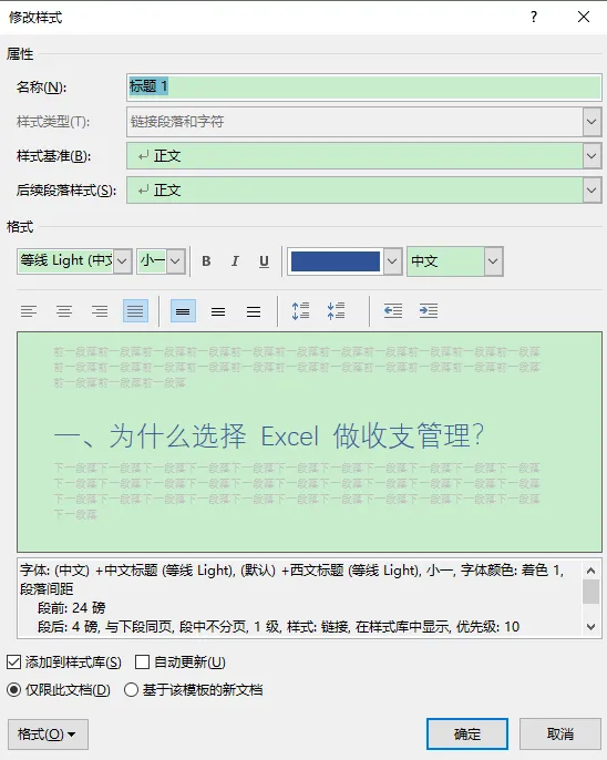若默认样式不符合排版要求(如字体、行距),可右键对应标题样式→修改,调整字体、字号、段落间距等,勾选 “基于该模板的新文档”,确保全文档样式统一;