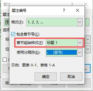 点击【编号】,勾选包含章节编号,选择章节标题的样式(如标题 1),确定后,图表会自动生成 “章号 - 序号” 的题注(如图 1-1);