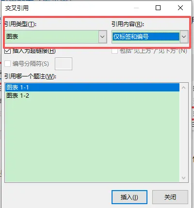 【引用类型】选择「图」/「表」,【引用内容】选择「仅标签和编号」(如仅显示图 1-2);