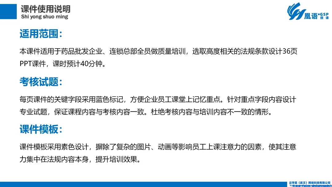 本课件适用于药品批发企业、连锁总部全员做质量培训,选取高度相关的法规条款设计36页PPT课件,课时预计40分钟。